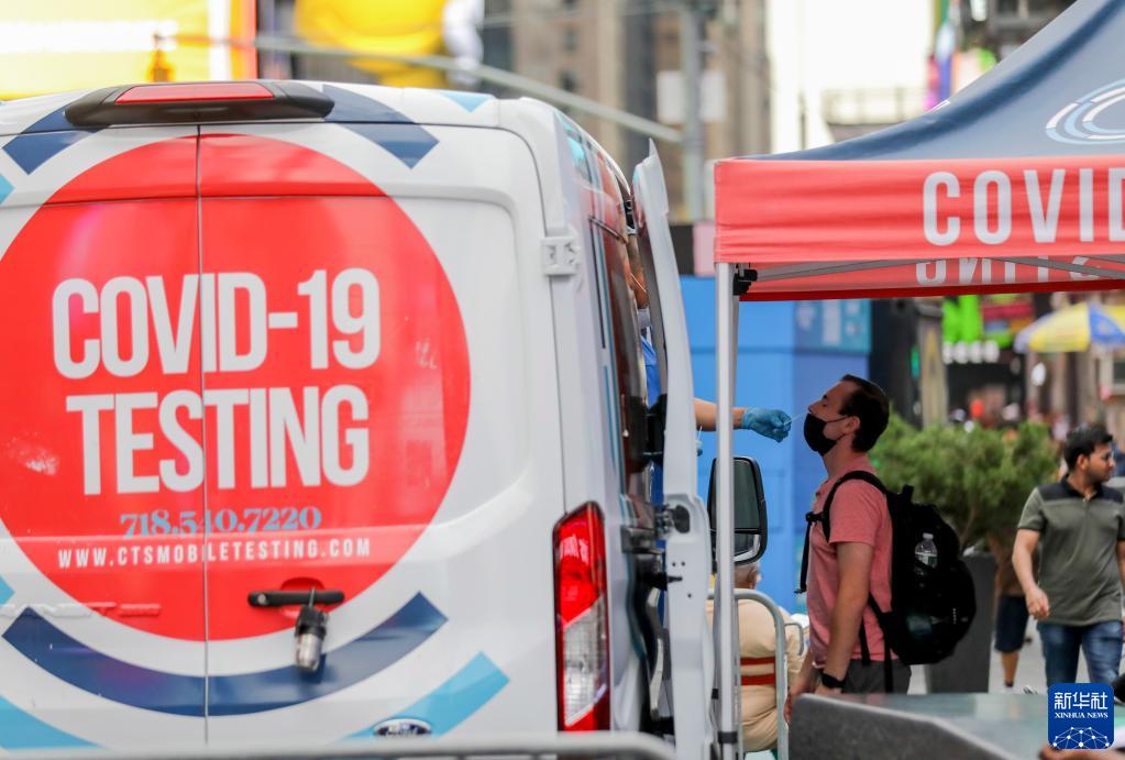 8月31日,一名男子在美国纽约时报广场的流动新冠检测点接受新冠病毒检测。 约翰斯·霍普金斯大学数据显示,美国截至8月23日至29日的7天内,累计新增新冠确诊病例108.9万例,累计死亡病例9036例。 新华社记者 王迎 摄