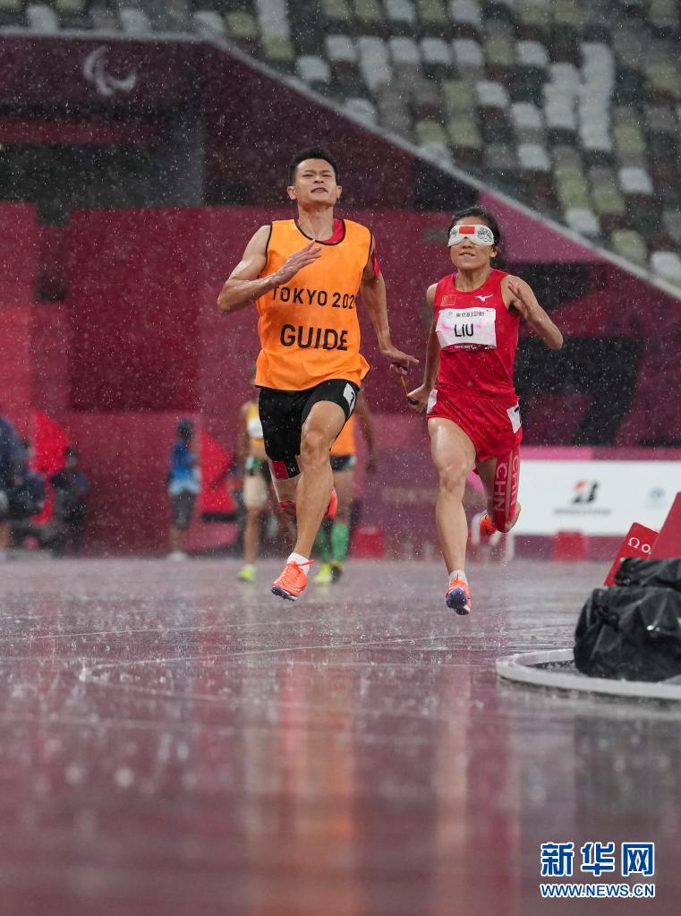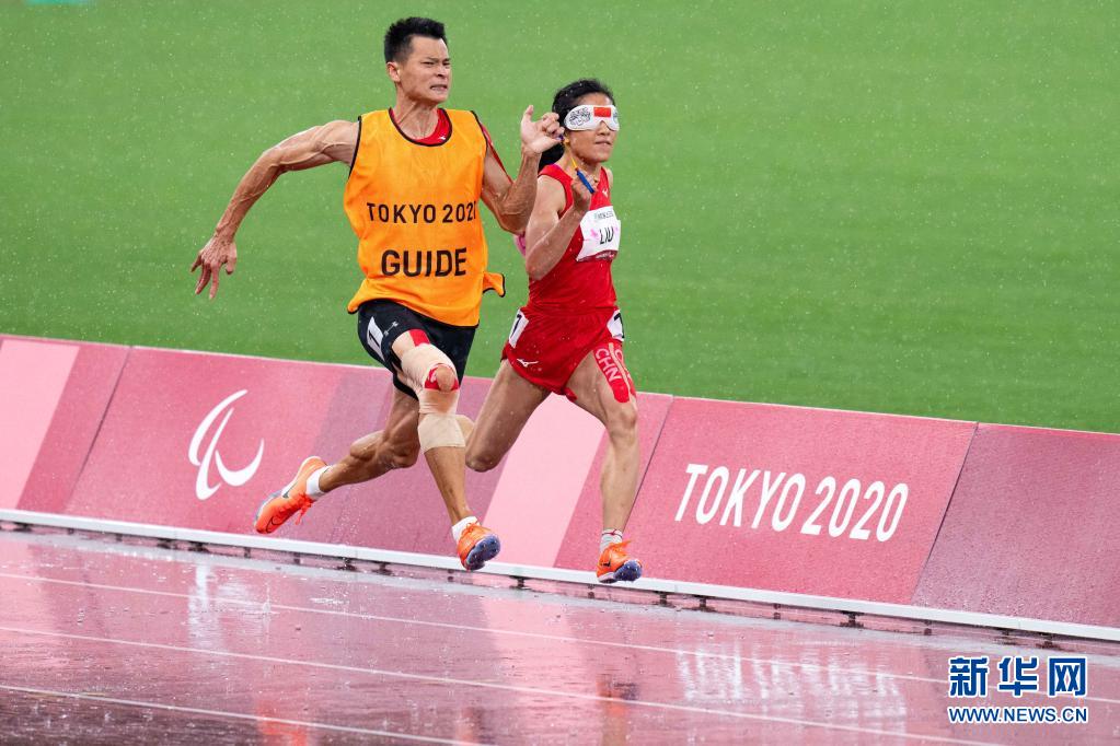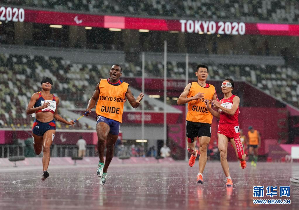 8月31日,刘翠青(右)与领跑员徐冬林在比赛中。 当日,在东京残奥会田径女子100米T11级决赛中,中国选手刘翠青获得亚军。 新华社记者 胡虎虎 摄