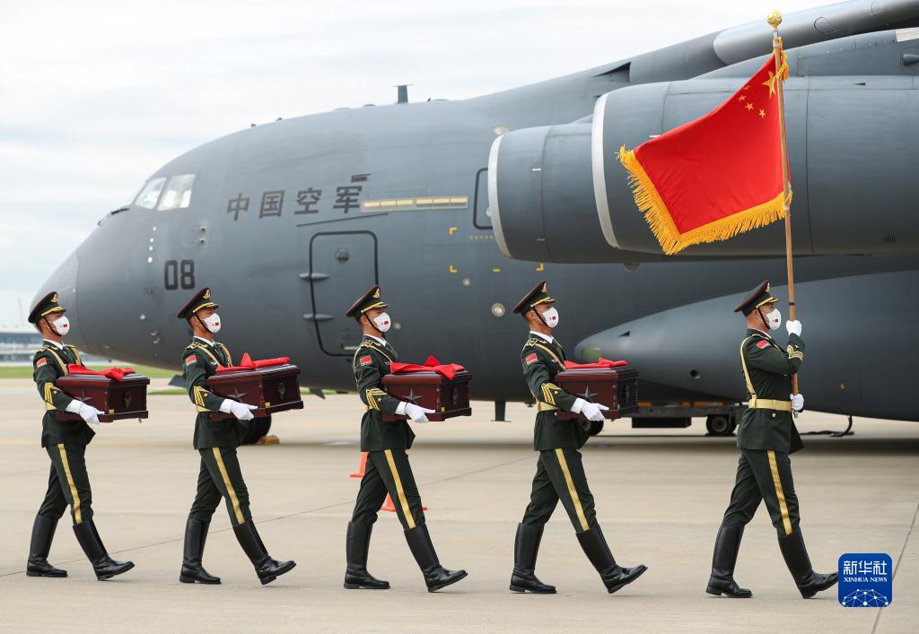 9月2日,在韩国仁川国际机场,中国人民解放军礼兵护送烈士棺椁登上解放军空军专机。9月2日上午,中国和韩国在韩国仁川国际机场共同举行在韩中国人民志愿军烈士遗骸交接仪式。新华社记者 王婧嫱 摄