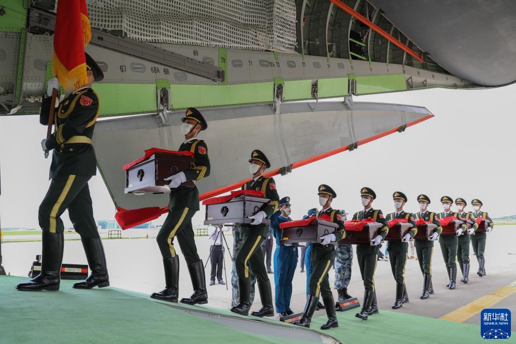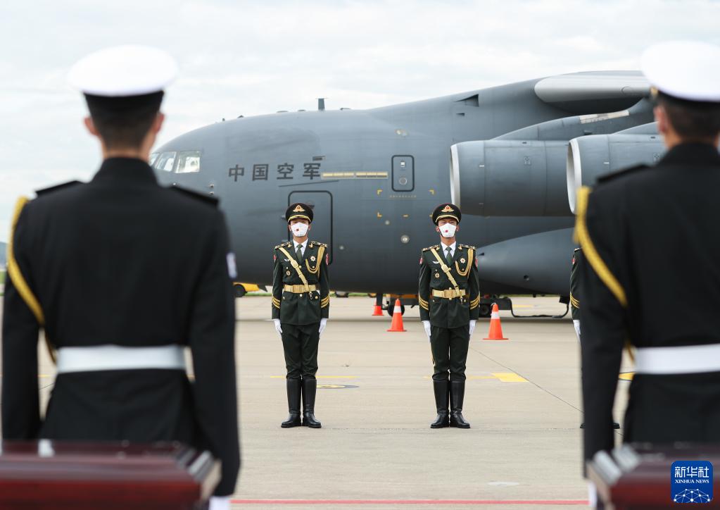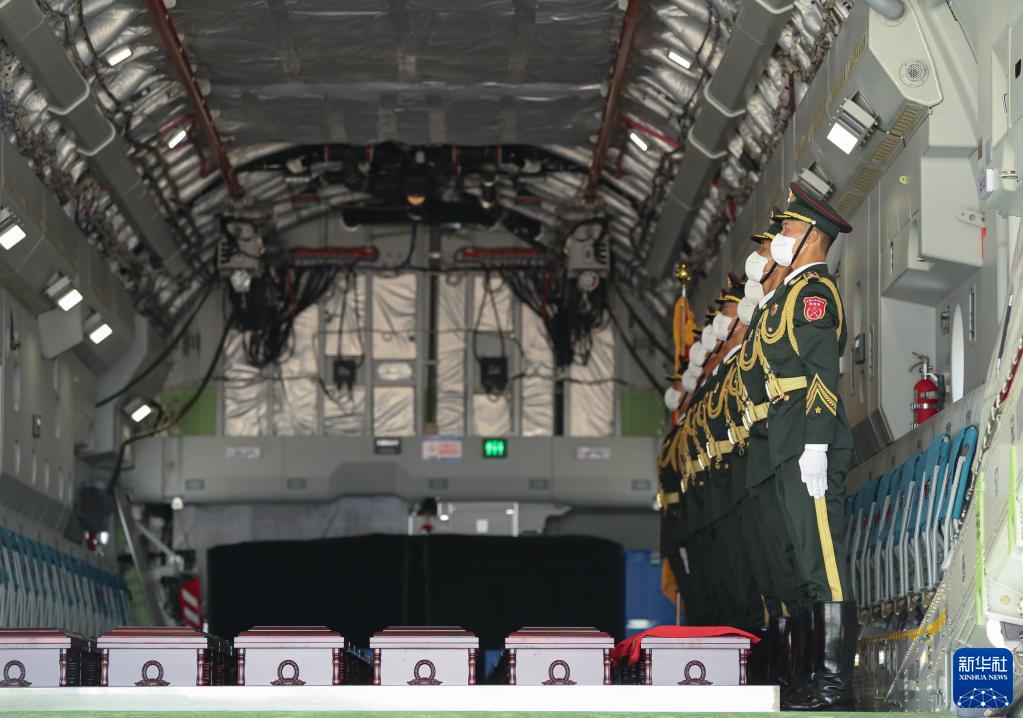 9月2日,在韩国仁川国际机场,中国人民解放军礼兵护送烈士棺椁登上解放军空军专机。9月2日上午,中国和韩国在韩国仁川国际机场共同举行在韩中国人民志愿军烈士遗骸交接仪式。新华社记者 王婧嫱 摄