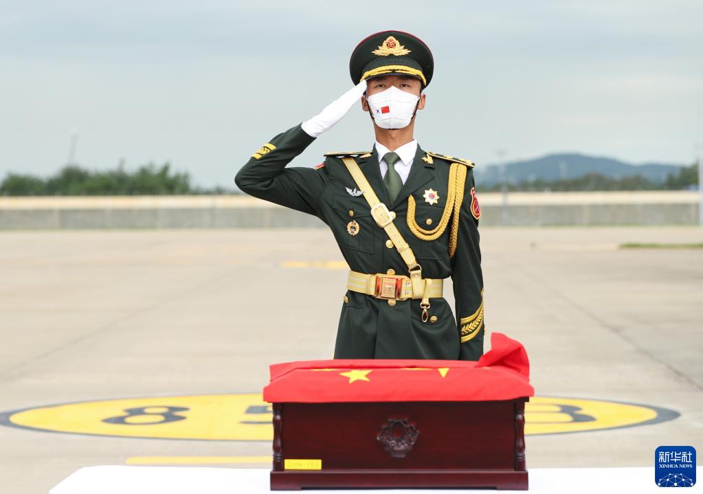 9月2日,在韩国仁川国际机场,中国人民解放军礼兵(左)从韩方接过中国人民志愿军烈士棺椁。新华社记者 王婧嫱 摄