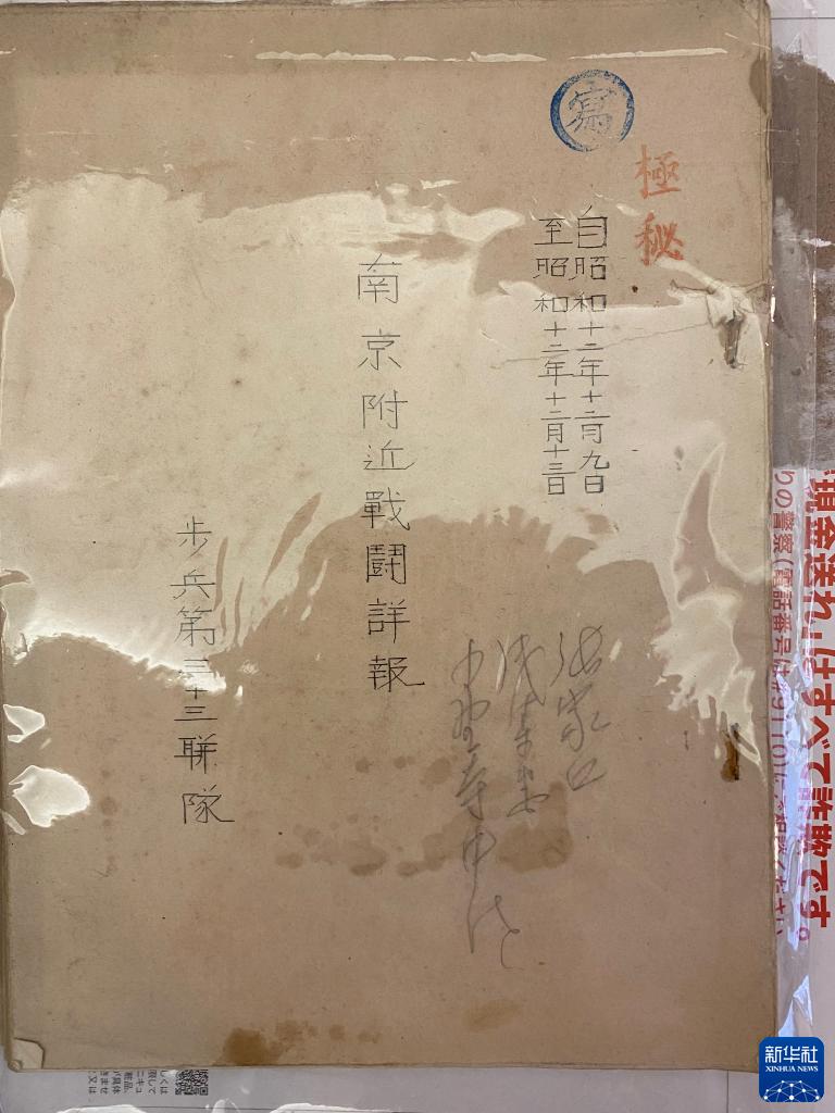 这是8月5日日本爱知县圆光寺住持大东仁送到东京的与侵华日军相关的历史资料《极密 自昭和十二年(1937年)十二月九日至十二月十三日 步兵第33连队 南京附近战斗详报》。新华社记者 郭丹 摄