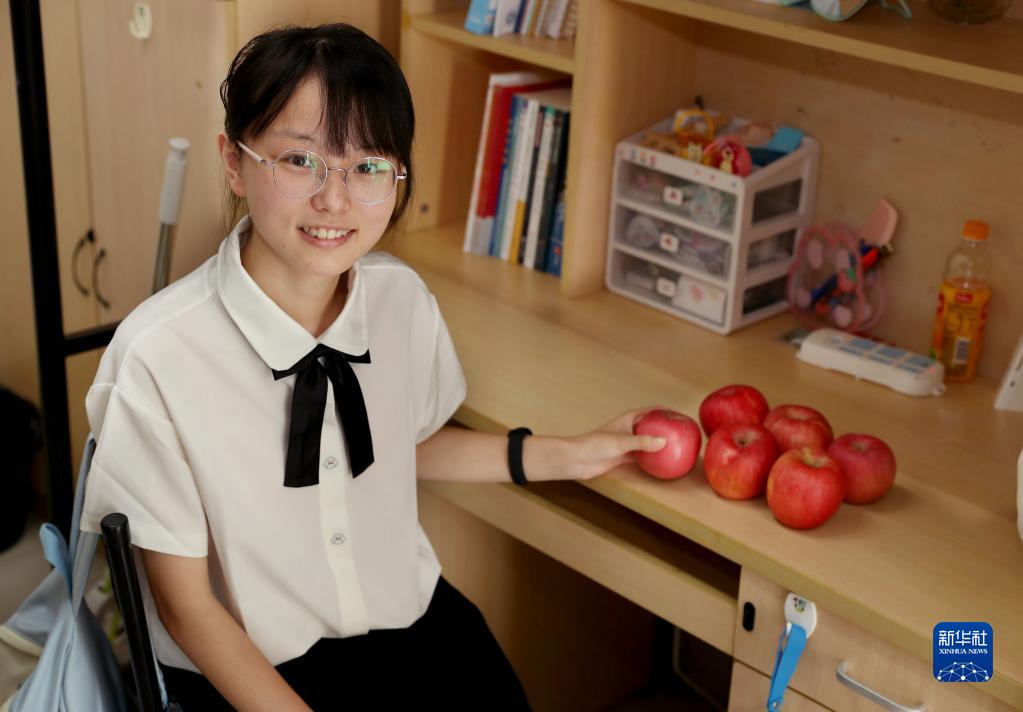 华东师范大学大夏书院的新生、来自四川绵阳的杨慧杰展示离家时外婆塞在自己行李箱的6个苹果(9月4日摄)。 近日,上海各高校陆续迎来2021年新生报到。由于疫情防控,家长和陪同人员不能入校,很多新生独自从故乡来到大学校园。记者请华东师范大学的几名本科新生打开行李箱,展示他们最珍视、最有意义的随行物品,家乡特产、民族服饰、老师寄语、家人的礼物、长辈的祝福……满满的爱,将陪伴随着新生们在上海开始大学生活,开启人生的新阶段。 新华社记者 刘颖 摄