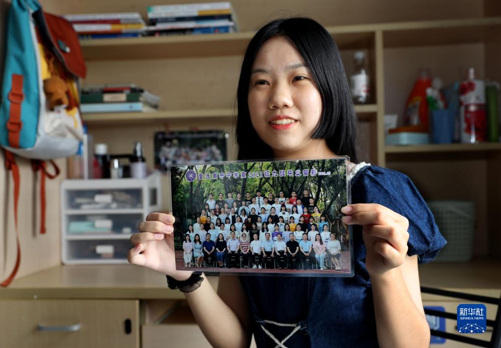 华东师范大学大夏书院的新生、来自重庆的邓欣怡展示自己高中班级的毕业合影(9月4日摄)。 近日,上海各高校陆续迎来2021年新生报到。由于疫情防控,家长和陪同人员不能入校,很多新生独自从故乡来到大学校园。记者请华东师范大学的几名本科新生打开行李箱,展示他们最珍视、最有意义的随行物品,家乡特产、民族服饰、老师寄语、家人的礼物、长辈的祝福……满满的爱,将陪伴随着新生们在上海开始大学生活,开启人生的新阶段。 新华社记者 刘颖 摄