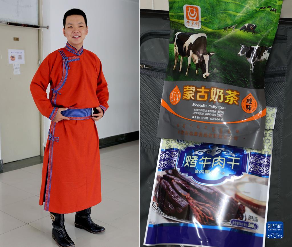 拼版照片:左为华东师范大学孟宪承书院的新生、来自内蒙古呼和浩特的白阿希达展示妈妈让自己带到学校的蒙古族服装;右为妈妈让他带到学校的特色食品(8月30日摄)。 近日,上海各高校陆续迎来2021年新生报到。由于疫情防控,家长和陪同人员不能入校,很多新生独自从故乡来到大学校园。记者请华东师范大学的几名本科新生打开行李箱,展示他们最珍视、最有意义的随行物品,家乡特产、民族服饰、老师寄语、家人的礼物、长辈的祝福……满满的爱,将陪伴随着新生们在上海开始大学生活,开启人生的新阶段。 新华社记者 王翔 摄