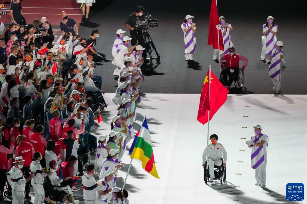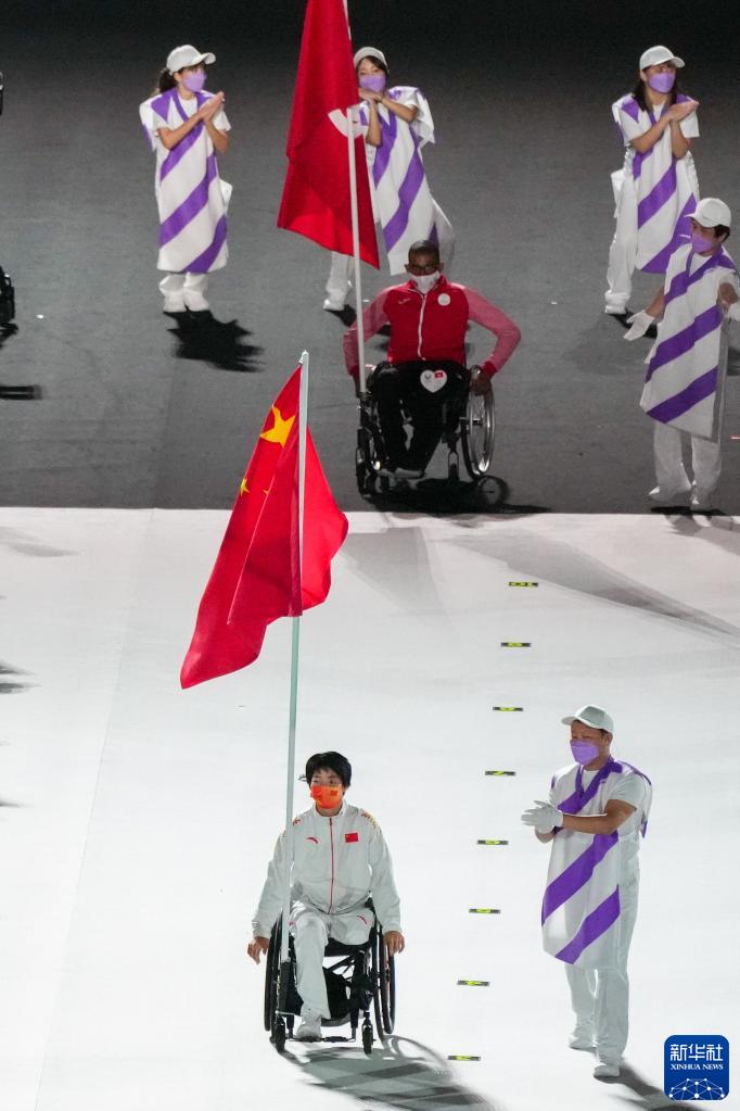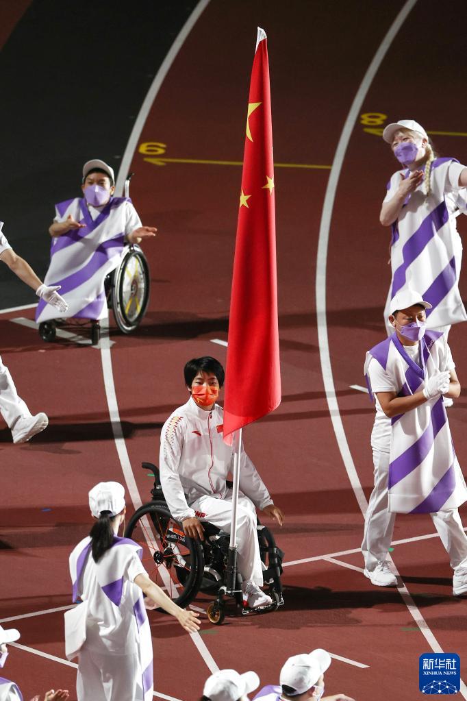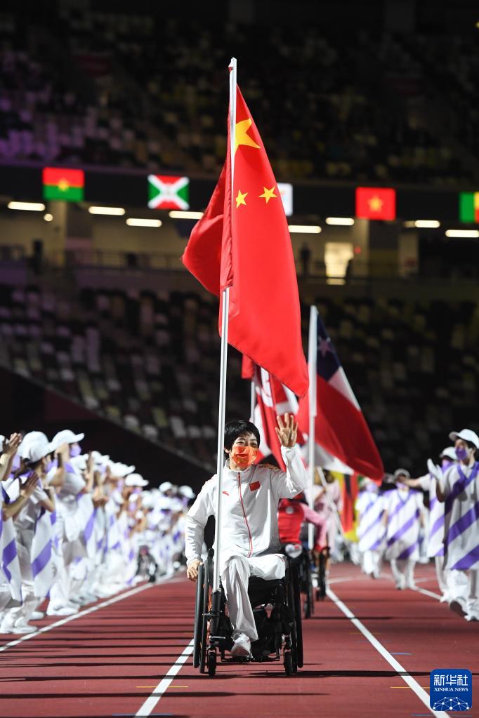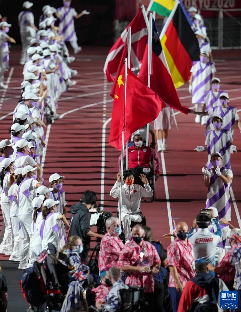 9月5日,第16届夏季残疾人奥林匹克运动会闭幕式在日本东京举行。 这是中国体育代表团旗手张雪梅(中)入场。 新华社记者 杜潇逸 摄
