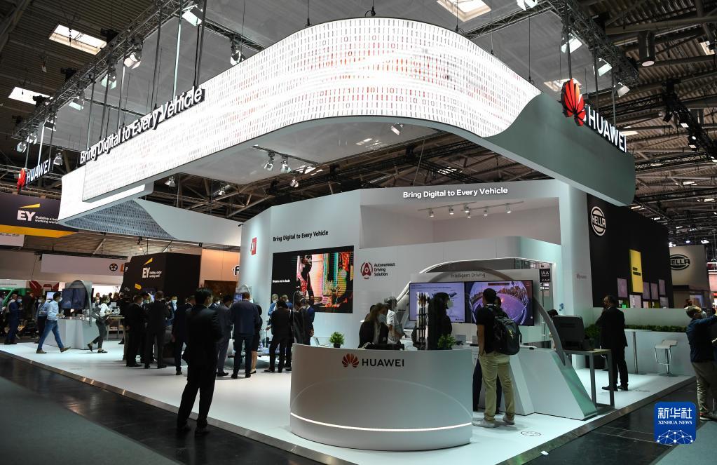 9月7日,人们在德国慕尼黑国际车展上参观华为展台。新华社记者 逯阳 摄