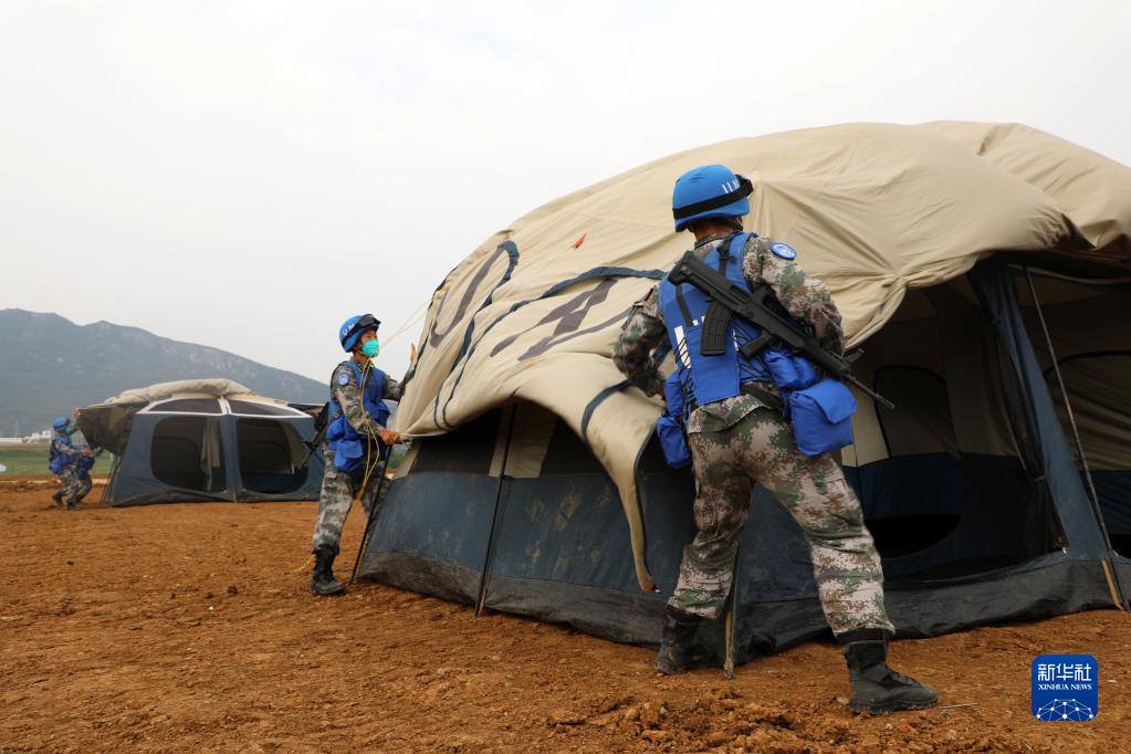 9月7日,在“共同命运-2021”国际维和实兵演习专业分训中,参演官兵在临时行动基地建设课目中搭建帐篷。 新华社记者 刘芳 摄