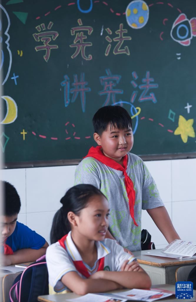 9月9日,青年志愿者在东林镇第二小学给学生们发普法宣传资料。