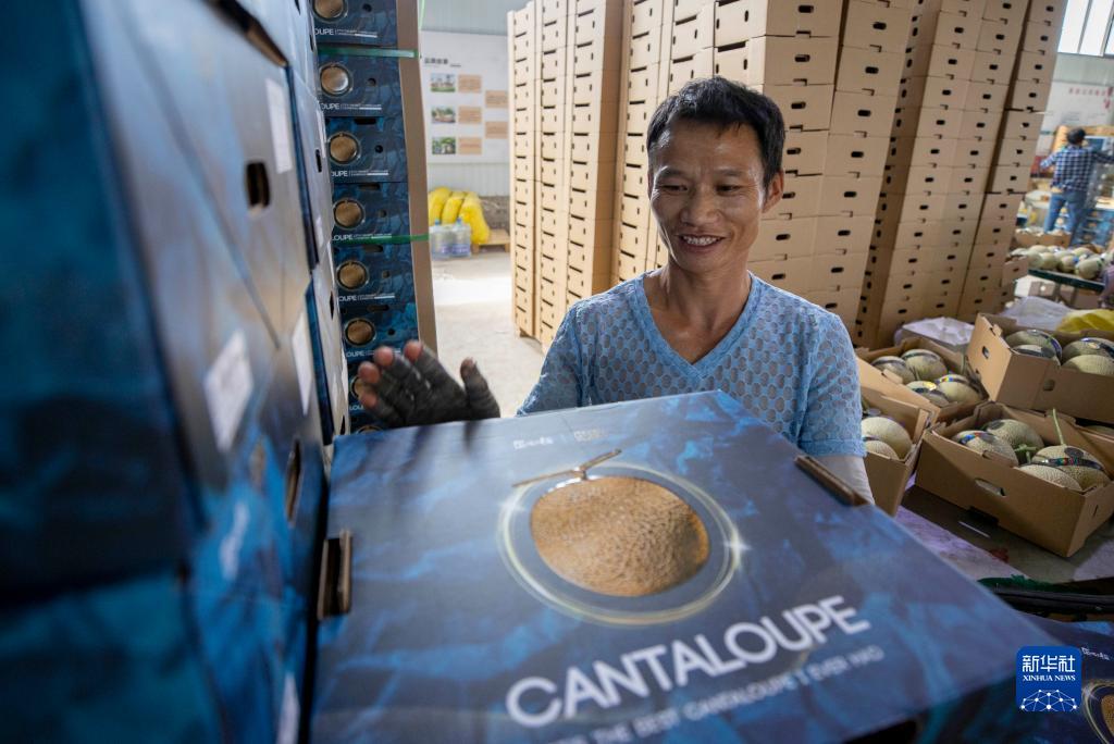 9月8日,农民在宁夏灵武市郝家桥镇泾灵新村蜜瓜种植基地码放已经装箱的蜜瓜。