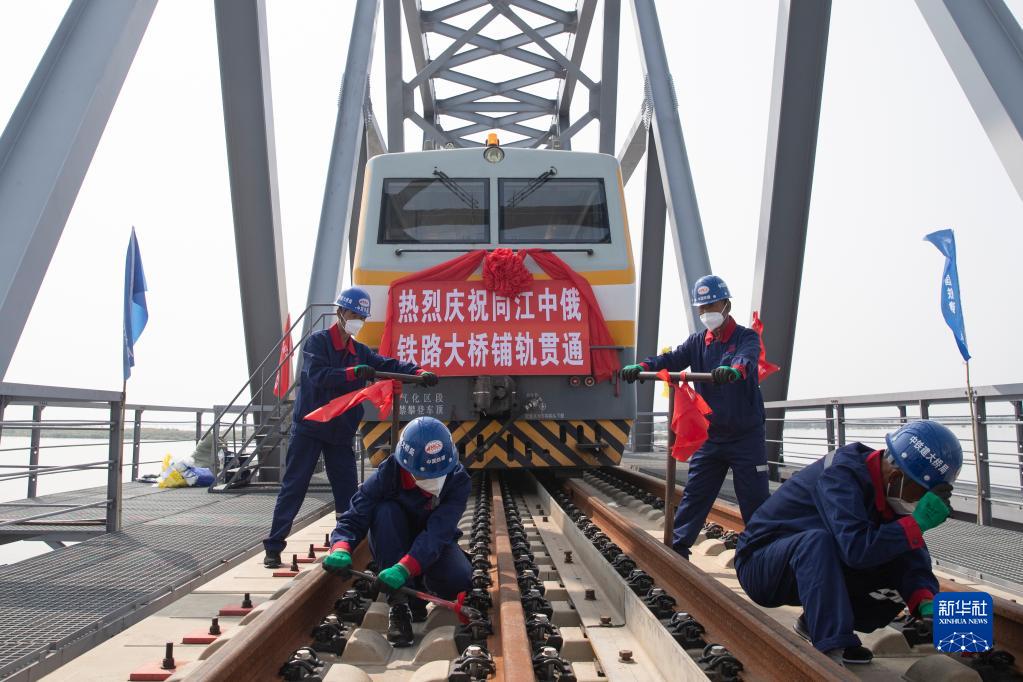 2021年8月17日,工人在同江中俄黑龙江铁路大桥施工现场进行施工。同江中俄黑龙江铁路大桥位于中国黑龙江省同江市与俄罗斯下列宁斯阔耶市之间,桥梁全长约7194米,主桥长约2215米,其中中方境内主桥长约1886米,设计运营时速100公里、年过货能力2100万吨。新华社记者 张涛 摄