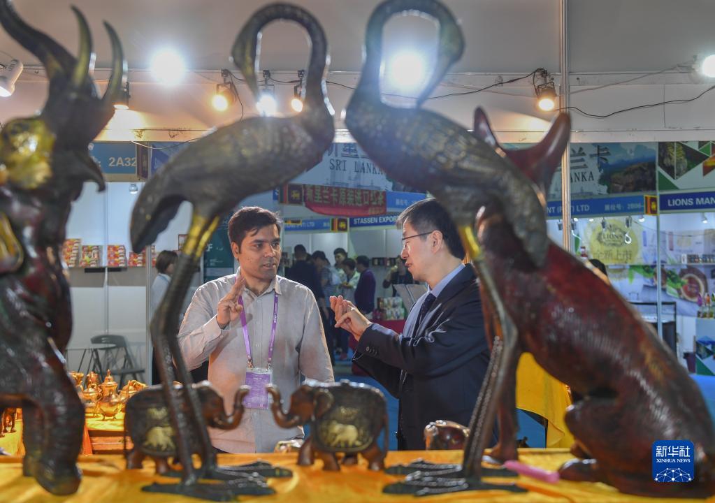2019年4月18日,在福建泉州石狮市举行的第五届中国(泉州)海上丝绸之路国际品牌博览会上,印度客商(左)向顾客推销印度工艺品。新华社记者 宋为伟 摄