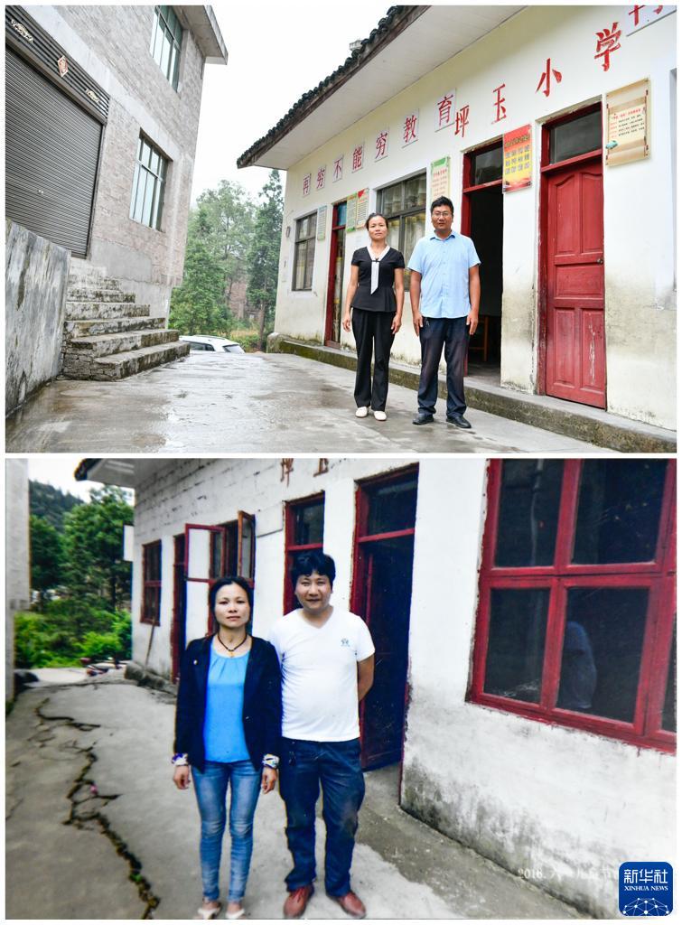 拼版照片:上图为2021年9月7日,潘仲勇、朱木群夫妇在坪玉教学点前的留影;下图为2016年6月1日,潘仲勇、朱木群夫妇在坪玉教学点前的留影(翻拍照片)。新华社记者 杨文斌 摄