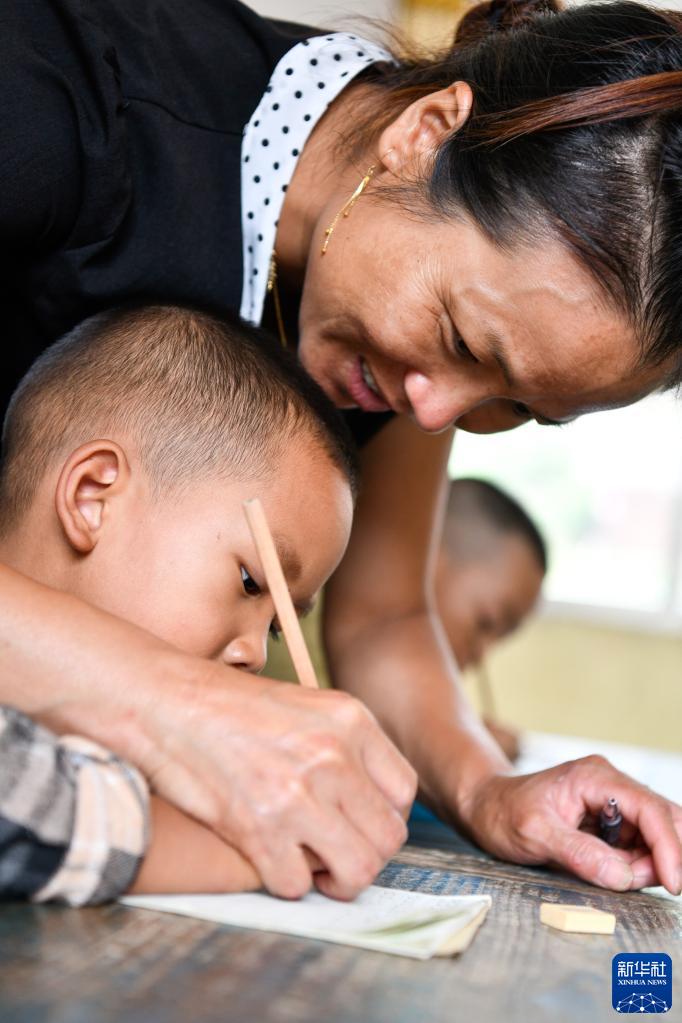9月7日,在贵州省镇远县报京乡松柏村坪玉教学点,朱木群在指导学前班孩子学写字。新华社记者 杨文斌 摄