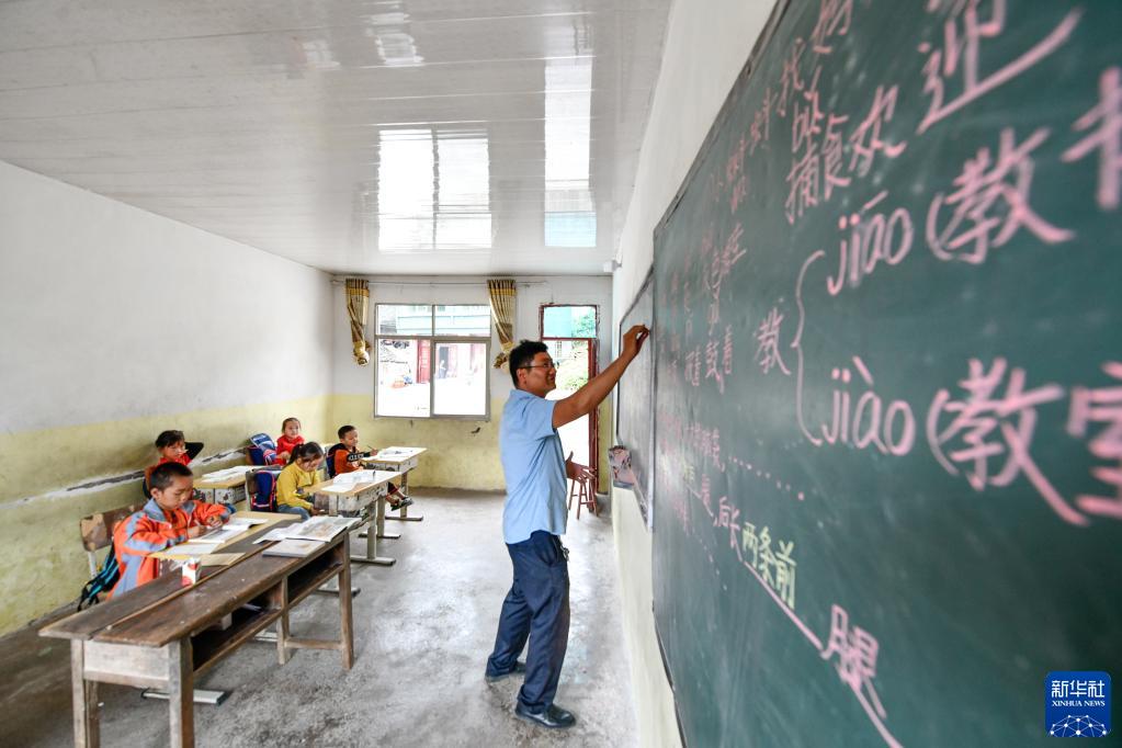 9月7日,在贵州省镇远县报京乡松柏村坪玉教学点,教师潘仲勇给学生上课。新华社记者 杨文斌 摄 |