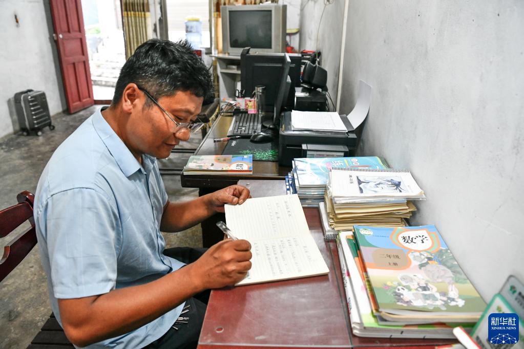 9月7日,贵州省镇远县报京乡松柏村坪玉教学点教师潘仲勇在备课。新华社记者 杨文斌 摄