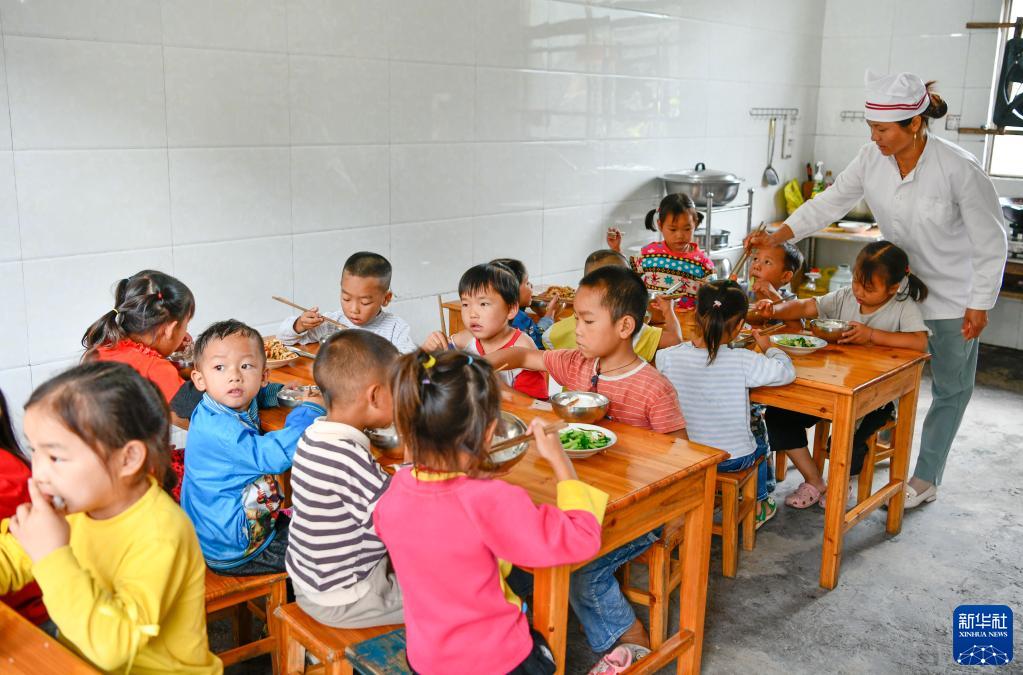 9月8日,在贵州省镇远县报京乡松柏村坪玉教学点,朱木群照顾孩子们吃营养餐。新华社记者 杨文斌 摄
