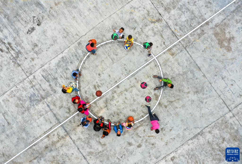 9月8日,贵州省镇远县报京乡松柏村坪玉教学点的孩子们在操场上玩抛球游戏(无人机照片)。新华社记者 杨文斌 摄