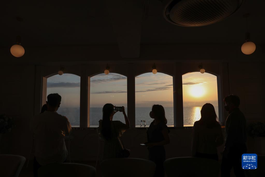 9月11日,人们在位于韩国仁川马嘶鞍海滩的一家咖啡馆欣赏落日余晖。 新华社记者 王婧嫱 摄
