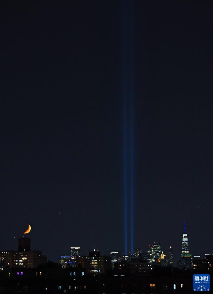 9月11日,美国纽约世贸中心遗址附近亮起象征纽约世贸中心“双子塔”大厦的光柱。新华社记者李睿摄