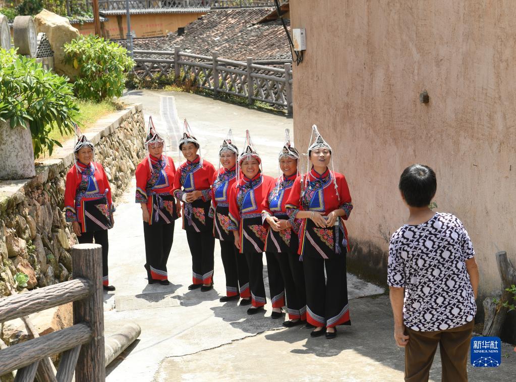 9月7日,在浙江景宁畲族自治县红星街道岗石村,新时代畲歌队成员向畲族群众宣讲。