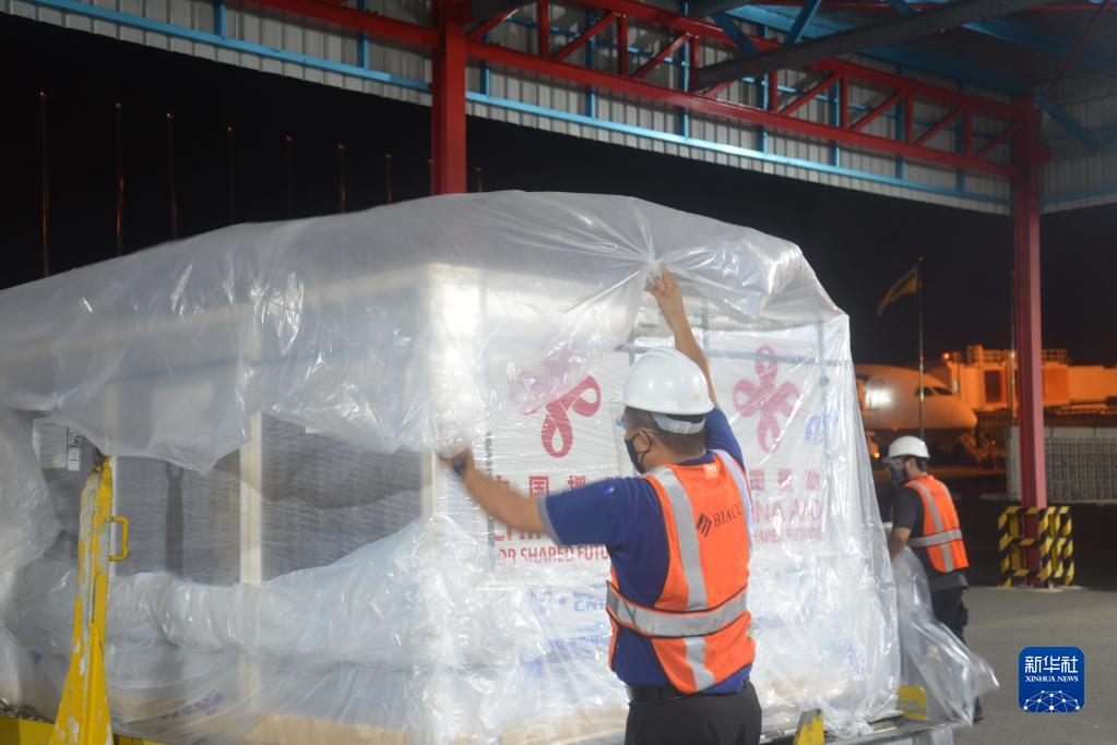 9月12日,在文莱斯里巴加湾国际机场,机场工作人员卸载中国捐赠的国药新冠疫苗。