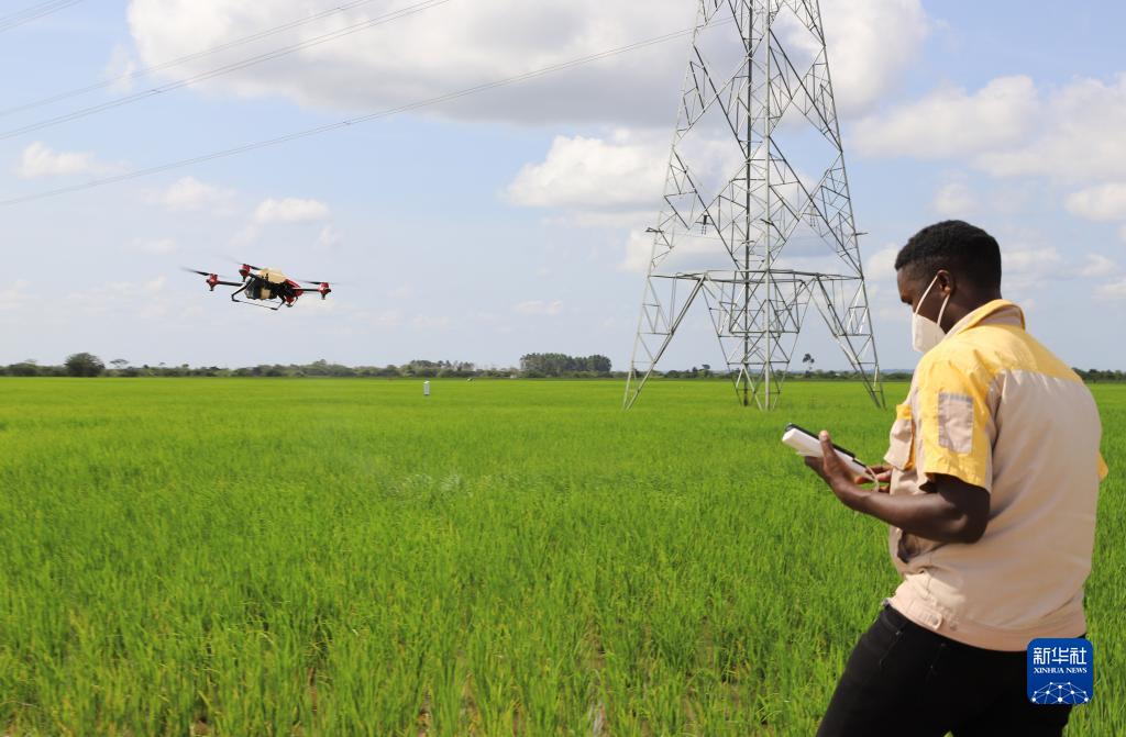 6月2日,在乌干达卡隆古区卢卡亚镇中亿农业园,作业员赫伯特·阿加巴操控植保无人机喷洒农药。 新华社记者 张改萍 摄 |