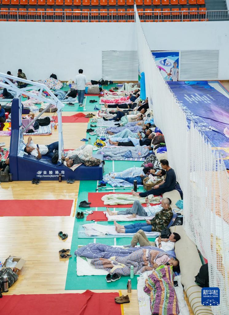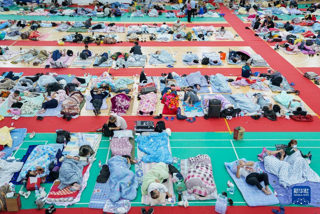 9月14日,群众在位于上海浦东的临时安置点内休息。 当日,受台风“灿都”影响,上海局部地区雨量较明显并伴随阵风。为确保安全,全市已转移安置相关人员达32.9万人。 新华社记者 丁汀 摄