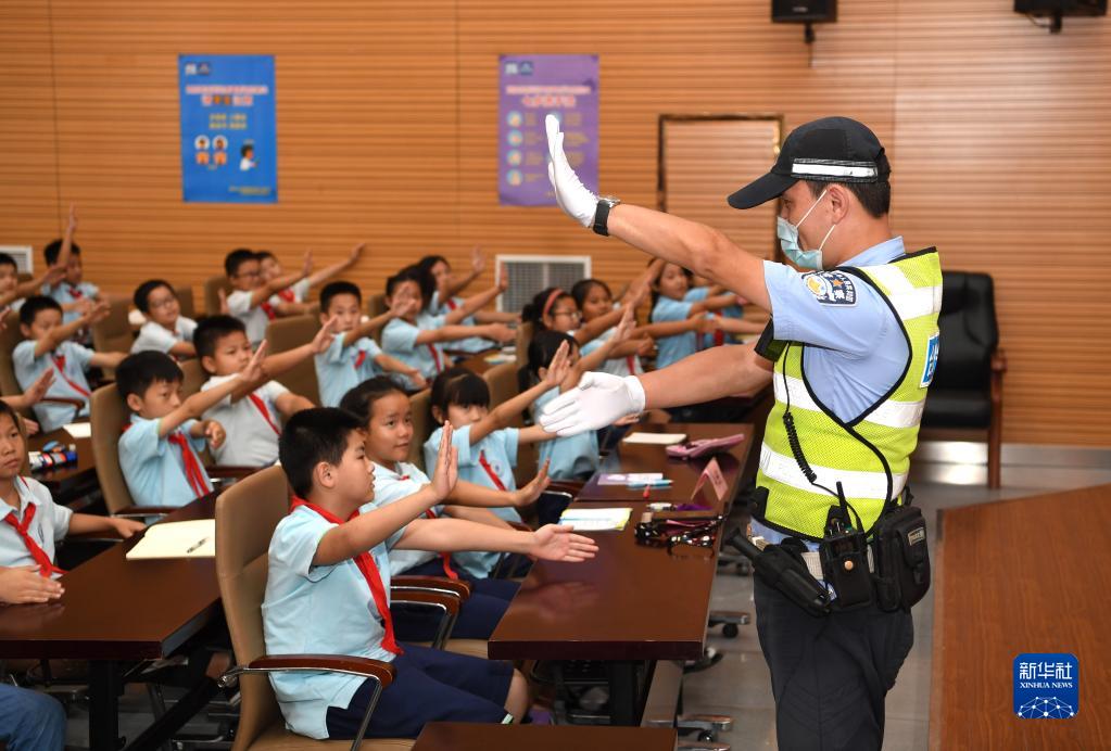 9月13日,合肥市公安局交警支队包河大队民警教学生们学习交警手势。 当日,安徽省合肥市包河区姚公社区在合肥市锦城小学开展“交通安全教育进校园”活动,邀请合肥市公安局交警支队包河大队民警为孩子们普及交通安全知识,助力新学期安全出行。 新华社记者 刘军喜 摄
