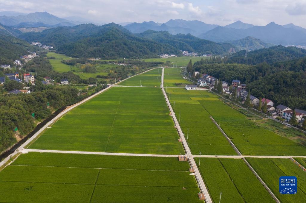 9月16日,空中俯瞰杭州市临安区太阳镇“90后”新农人余岳峰承包的稻田(无人机照片)。“90后”新农人余岳峰从浙江农林大学毕业后回乡承包了600多亩农田,应用数字化管理,使用完善的机械作业、无人机植保、病虫害实时监控等现代农业技术,构建了病虫害绿色防控融合统防统治体系,打造现代化粮仓。