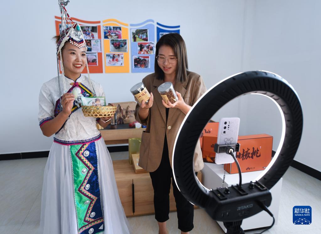 9月16日,陈小娇(右)在杭州市临安区太阳镇枫树岭村的工作室里与畲族同事一起直播推介当地的土鸡蛋和山核桃。归国留学青年陈小娇创办一亩耘乡创客工作室,积极推介民族村——枫树岭村的特色农产品和畲族文化,辐射带动周边20余人就业。