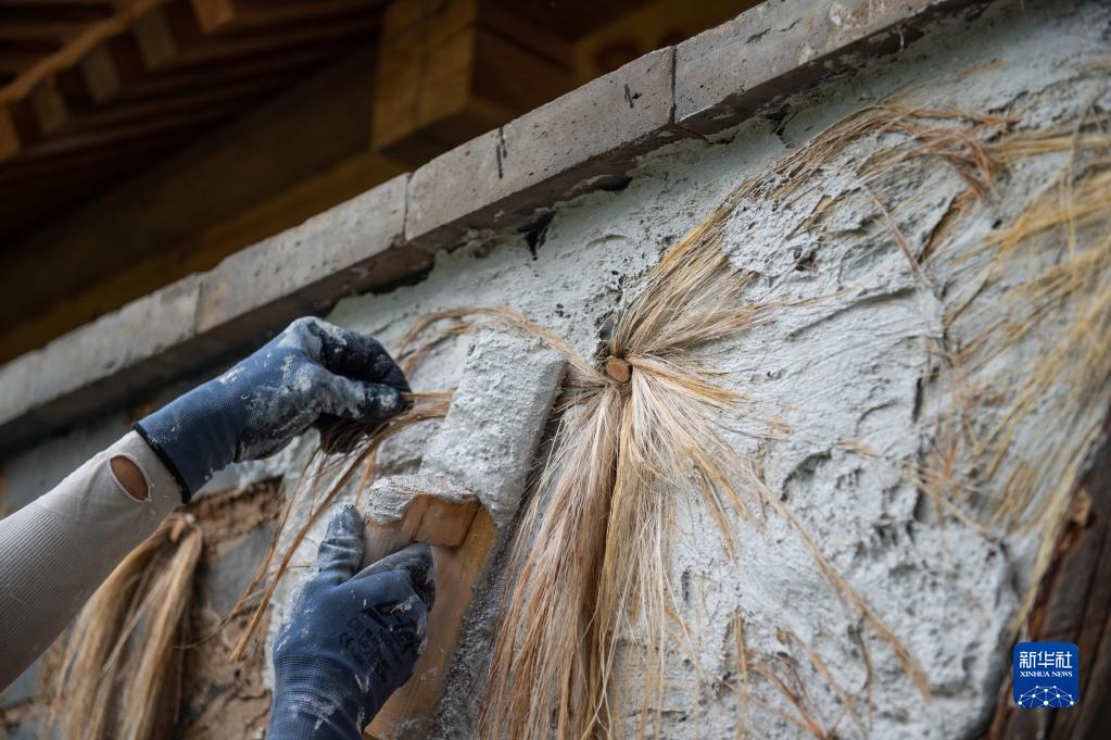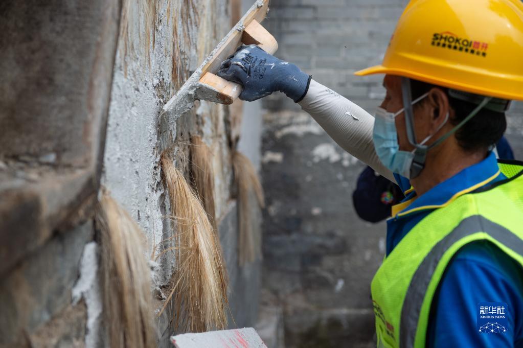 9月16日,工人在墙体上“分麻”,即在抹灰过程中将麻丝以发散状抹入墙体。 当日,位于北京市海淀区的万寿寺修缮工地举行开放日活动,向公众和媒体介绍万寿寺修缮进展和修缮院墙使用的“钉麻揪”传统工艺。“钉麻揪”即把制好的麻揪相互错开钉入墙面砖缝内,在抹灰过程中将麻丝以发散状抹入墙体,以提高抹灰层韧度和连接性能,避免墙灰脱落空鼓,起到固定墙体的作用。 万寿寺是全国重点文物保护单位。2018年3月,万寿寺修缮工程全面启动。 新华社记者 陈钟昊 摄