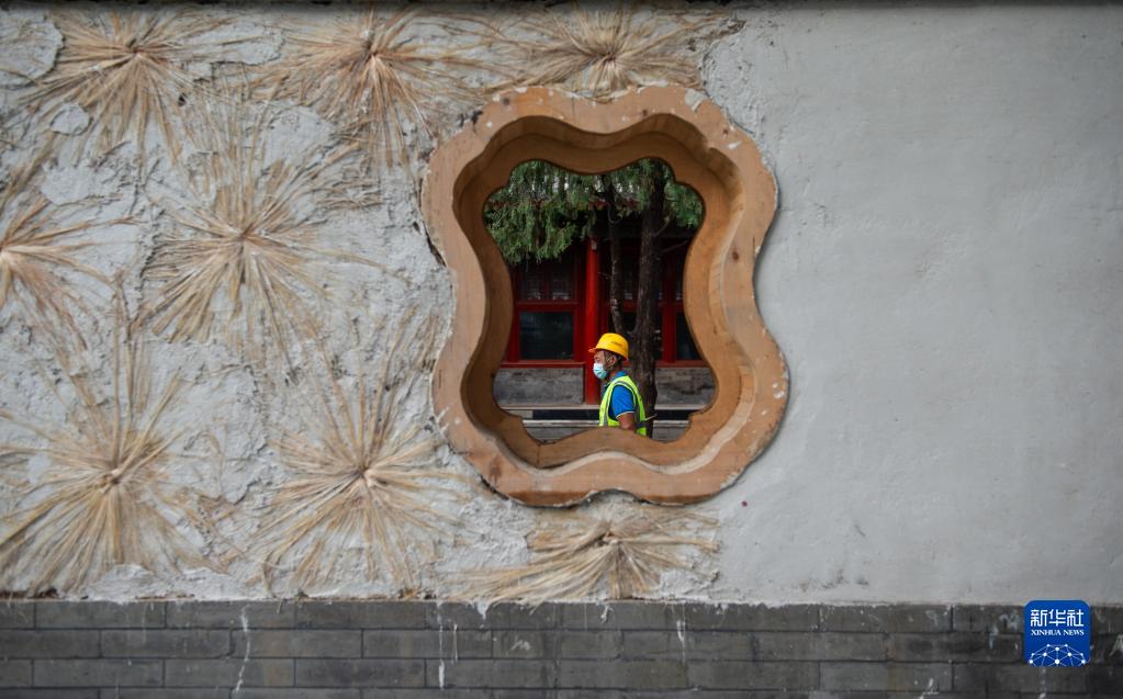 9月16日,工人在为万寿寺内墙体抹灰。 当日,位于北京市海淀区的万寿寺修缮工地举行开放日活动,向公众和媒体介绍万寿寺修缮进展和修缮院墙使用的“钉麻揪”传统工艺。“钉麻揪”即把制好的麻揪相互错开钉入墙面砖缝内,在抹灰过程中将麻丝以发散状抹入墙体,以提高抹灰层韧度和连接性能,避免墙灰脱落空鼓,起到固定墙体的作用。 万寿寺是全国重点文物保护单位。2018年3月,万寿寺修缮工程全面启动。 新华社记者 陈钟昊 摄