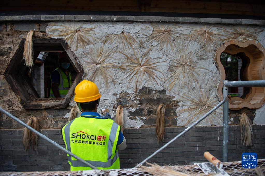 9月16日,工人在使用“钉麻揪”传统工艺修缮万寿寺内院墙。