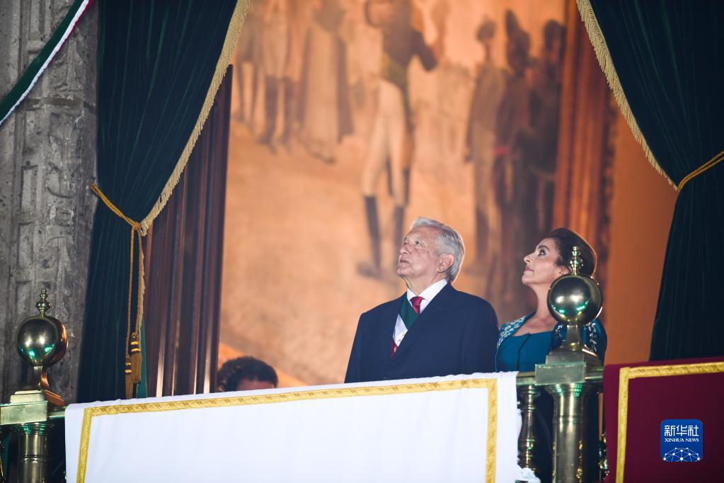 9月15日,墨西哥总统洛佩斯(左)和夫人在首都墨西哥城中心的国家宫出席独立日庆祝活动时挥手致意。