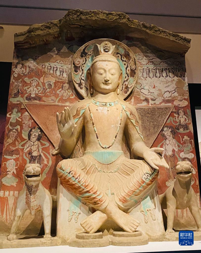 这是9月13日在日本东京艺术大学美术馆拍摄的用“文化遗产克隆技术”做出的、敦煌莫高窟第275窟交脚弥勒菩萨70%比例大小的佛像。