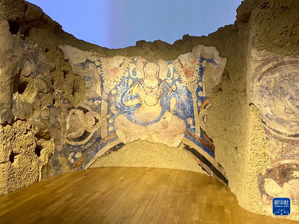 这是9月13日在日本东京艺术大学美术馆拍摄的用“文化遗产克隆技术”做出的阿富汗巴米扬E号窟天井壁画《青弥勒》。
