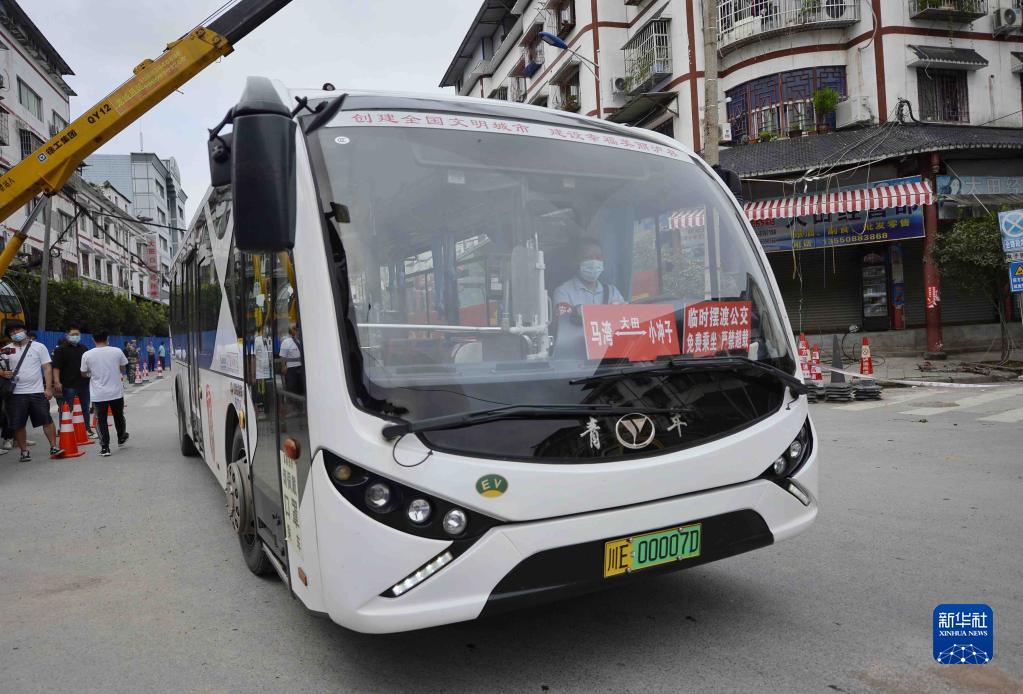 9月17日,一辆临时摆渡公交车行驶在泸县福集镇街头。 目前,四川泸县地震灾区救援工作平稳有序。截至9月17日12时,泸县地震灾害造成3人死亡,无新增死亡人数。 新华社记者 刘坤 摄