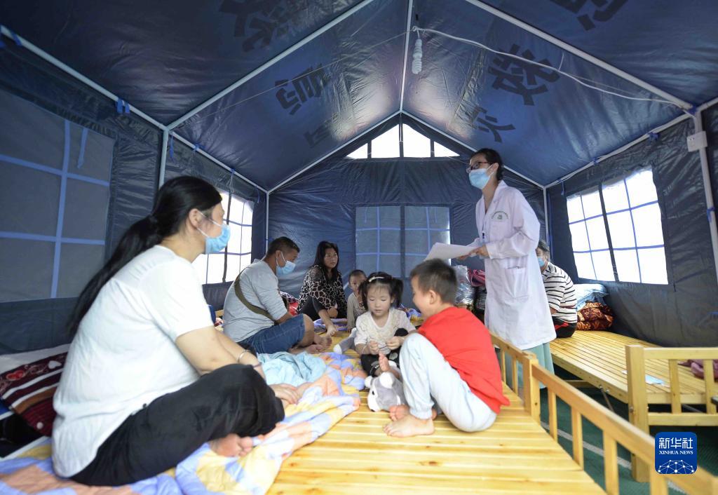 9月17日,医务人员在泸县福集镇大田社区安置点向受灾群众宣传震后防疫注意事项。