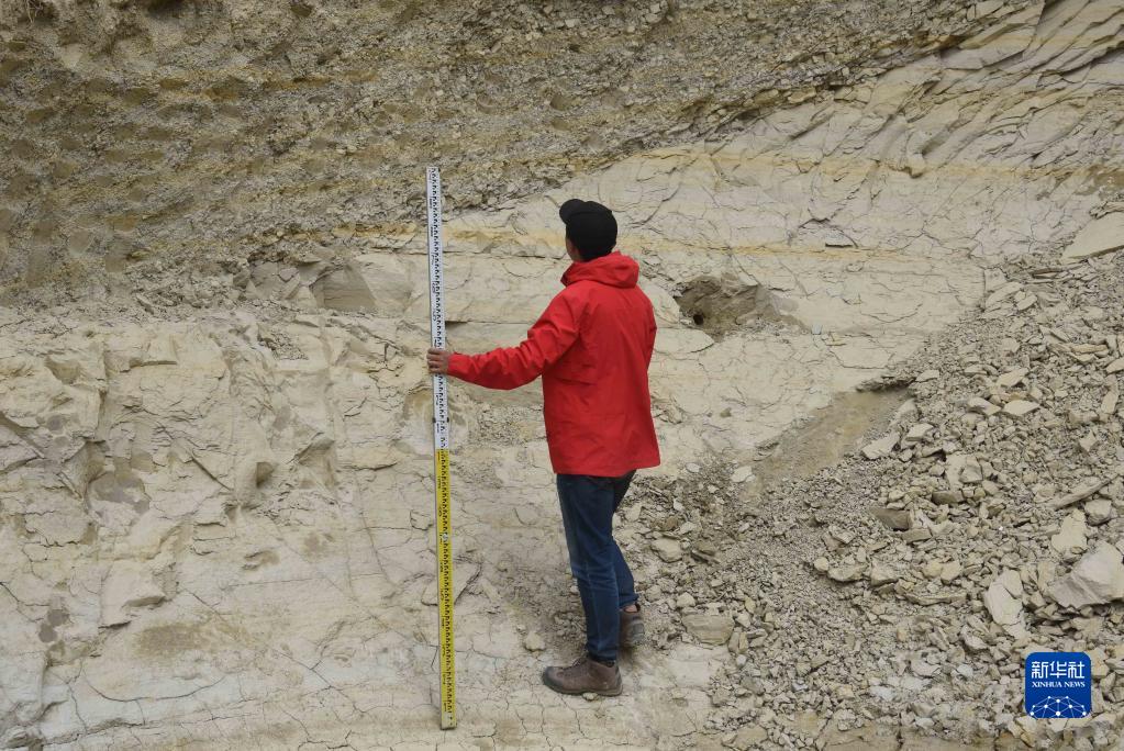 8月27日,在西藏日喀则市定结县一处山体,科考队员郭剑使用标尺,测量湖相沉积物厚度。