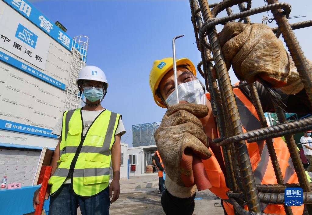 9月18日,工人在进行梁柱钢筋绑扎比赛。 当日,中建三局三公司2021年第一届质量技能“比武”大赛在北京分钟寺项目工地上举行。在建项目工人进行了梁柱钢筋绑扎技能比赛,以质量和技能比赛迎接中秋佳节。 新华社记者 李贺 摄