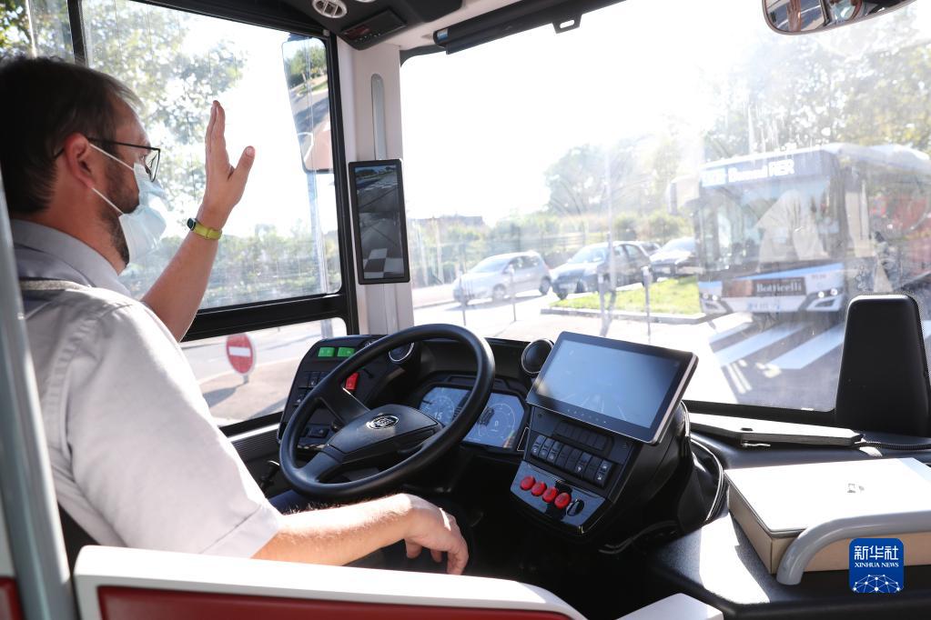 9月17日,在法国巴黎,巴黎大众运输公司公交司机在试驾“中车电动”制造的自动驾驶客车时与会车司机打招呼。
