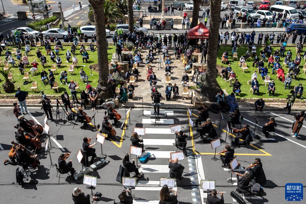 开普敦爱乐乐团15日午餐时间在户外举办“感恩音乐会”,向全国所有一线医护人员表达感激和赞赏。