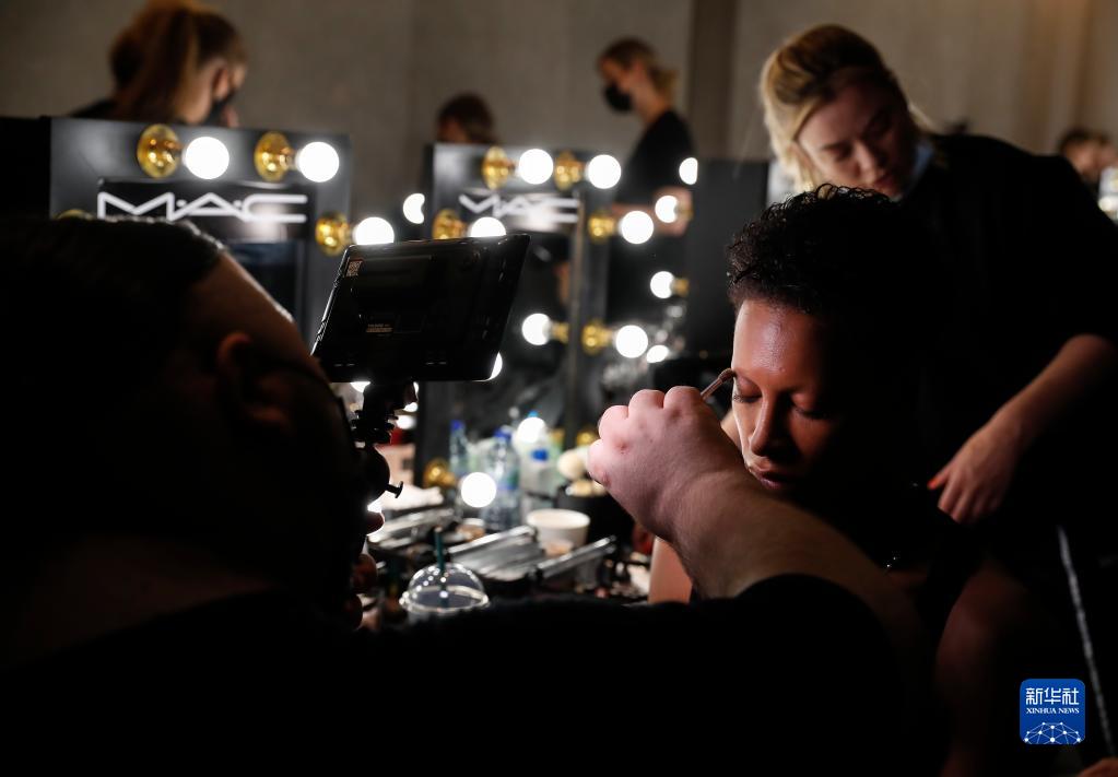 9月21日,模特在英国伦敦时装周后台为理查德·奎因品牌走秀做准备。