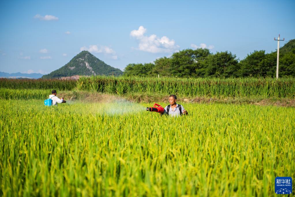 8月30日,在湖南省永州市寿雁镇深田村,村民给水稻施肥。 新华社记者陈思汗摄