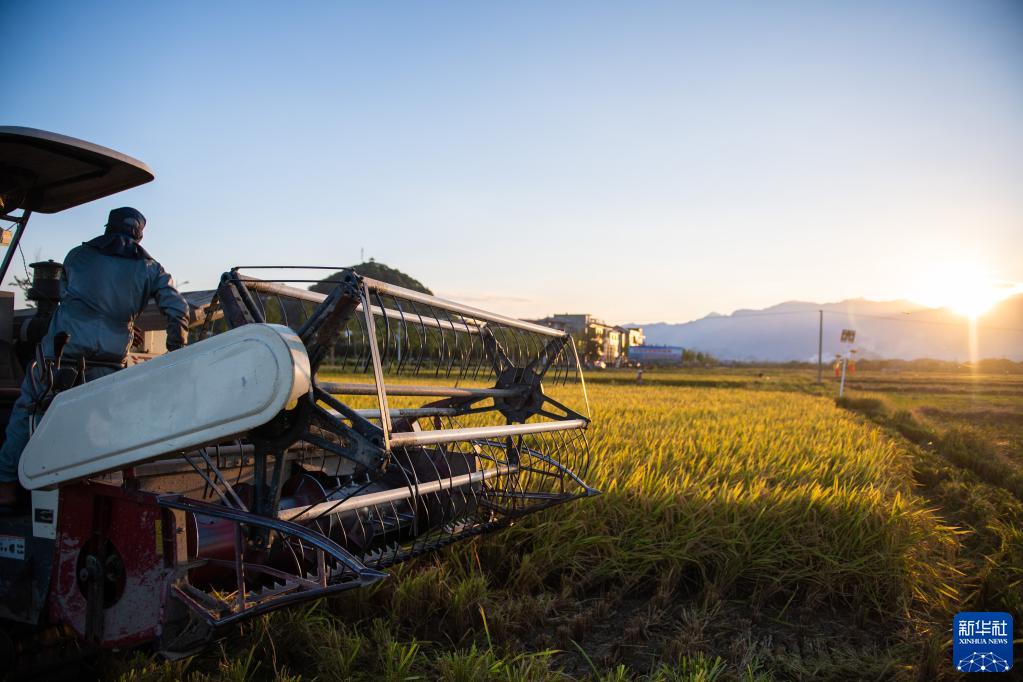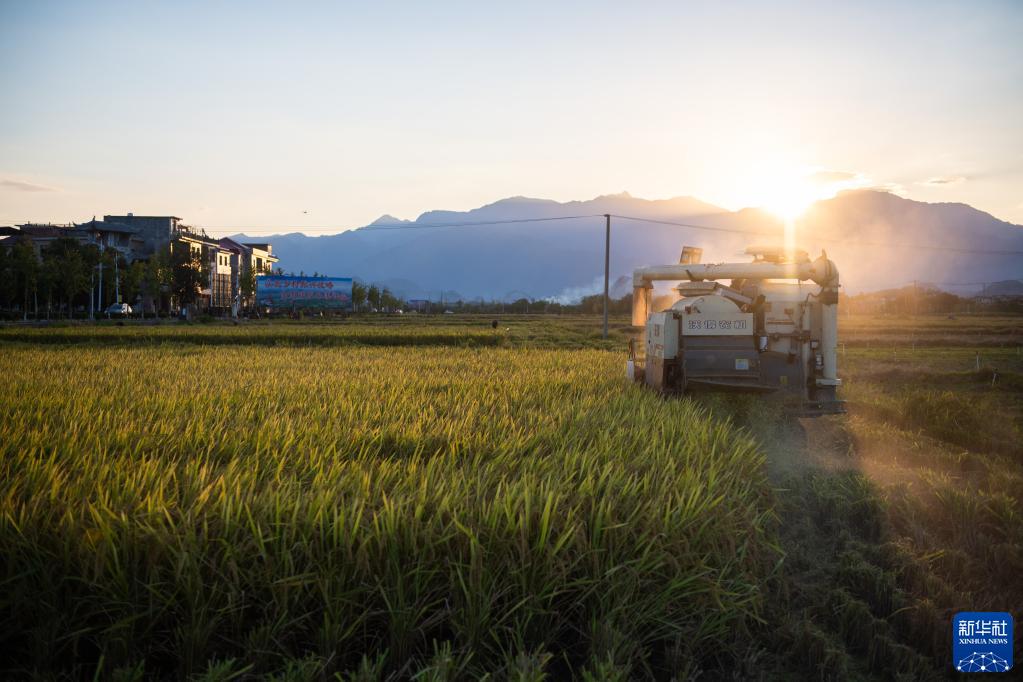 8月30日,工作人员驾驶收割机在湖南道县清塘镇濂溪大洞收割水稻。 新华社记者陈思汗摄