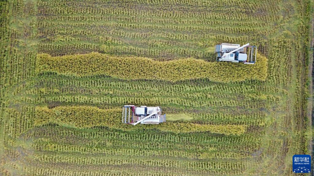工作人员驾驶收割机在湖南道县清塘镇濂溪大洞收割水稻(8月30日摄,无人机照片)。 新华社记者陈泽国 摄