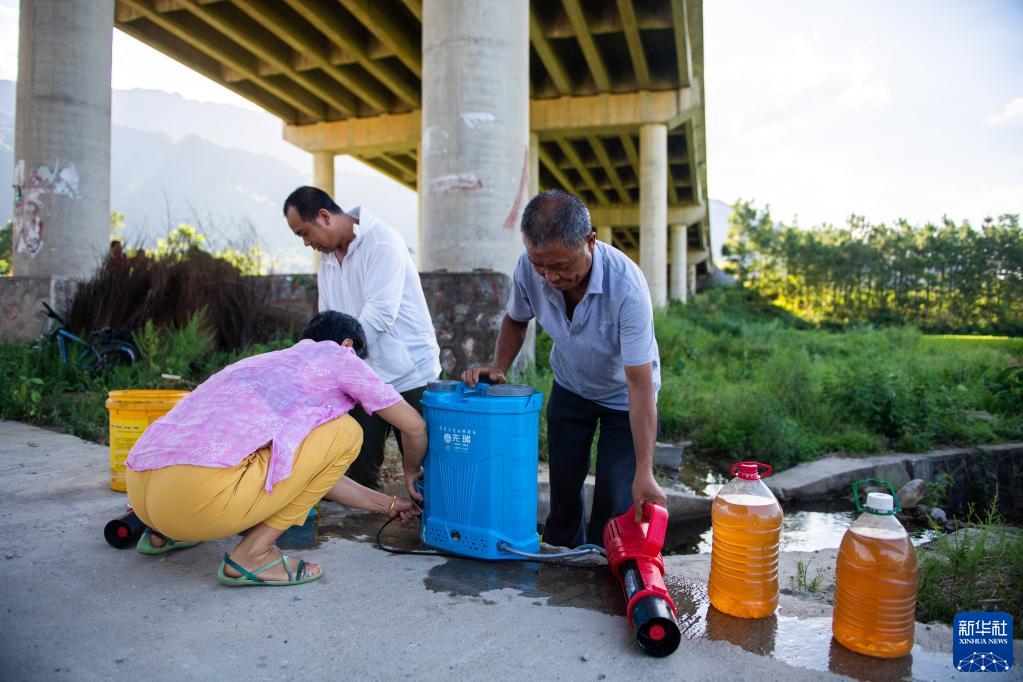 8月30日,在湖南省永州市寿雁镇深田村,村民唐志龙(右)、何中庆(中)和唐平秀(左)在农田附近,准备对酿制好的“环保酵素”进行稀释,制作肥料。 新华社记者陈思汗 |