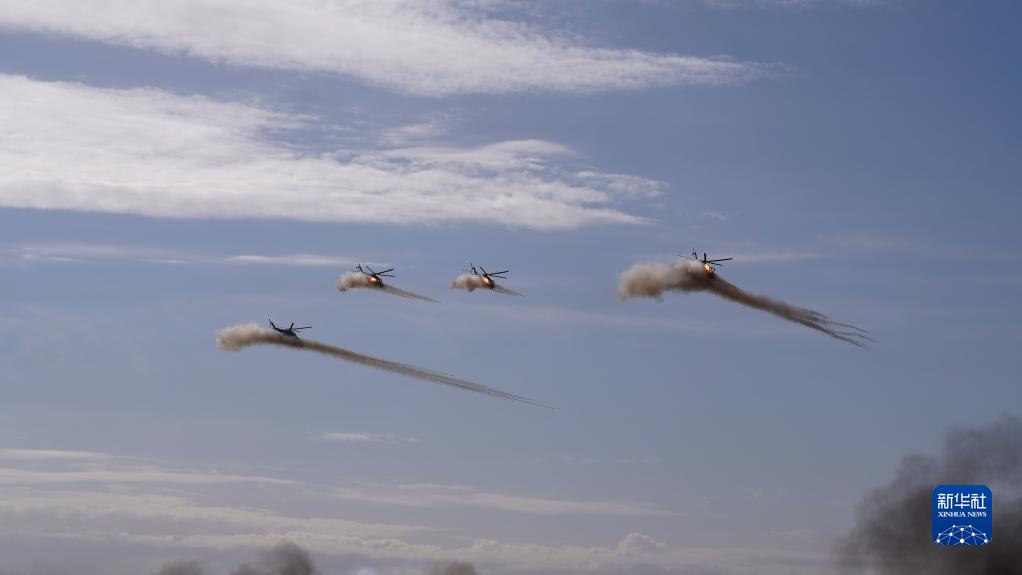 9月23日,在俄罗斯奥伦堡州东古兹靶场举行的“和平使命-2021”上海合作组织联合反恐军事演习实兵实弹演习中,多国联合部队陆航作战力量发射火箭弹。新华社记者 梅世雄 摄 就在多国联合部队刚刚完成防御部署时,“恐怖武装”再次集中兵力、火力,对多国联合部队防御正面展开强攻。 联合反恐集群指挥部立即调整部署。多国联合部队使用空中、炮兵和地面火力,对“恐怖武装”实施多波次密集火力打击,地面装甲集群坚守防御阵地,坚决抗击进攻之“恐怖武装”……