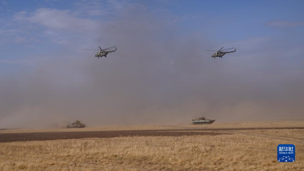 9月23日,在俄罗斯奥伦堡州东古兹靶场举行的“和平使命-2021”上海合作组织联合反恐军事演习实兵实弹演习中,多国联合部队工程保障队、通信保障队等支援保障力量投入战斗。新华社记者 梅世雄 摄 新华社俄罗斯奥伦堡9月23日电(记者梅世雄)空中,战机轰鸣;地上,铁流滚滚。23日,“和平使命-2021”上海合作组织联合反恐军事演习实兵实弹演习,在俄罗斯奥伦堡州东古兹靶场成功举行。 13时许,实兵实弹演习拉开序幕。记者在现场看到,滚滚硝烟中,漫天黄沙里,一台台步战车、突击车等装备雷霆出击,相继展开战斗队形向“恐怖武装”前沿发起猛烈攻击。
